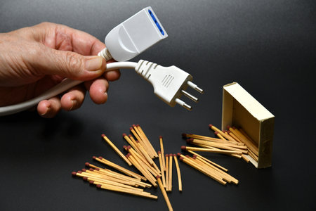 Hand connecting electrical plug cause electric shock, Idea for causes of home fire, Electric short circuit, Electrical hazard can ignite household items