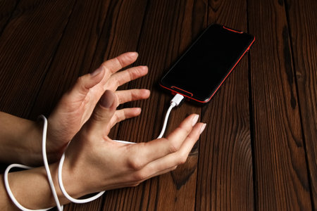 Female hands and smartphone. Woman's hands trapped and wrapped on wrists with mobile phone cable as handcuffs. Addiction to internet and social networks