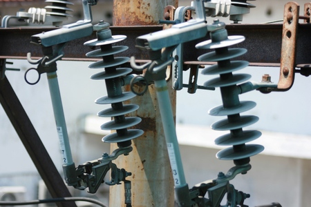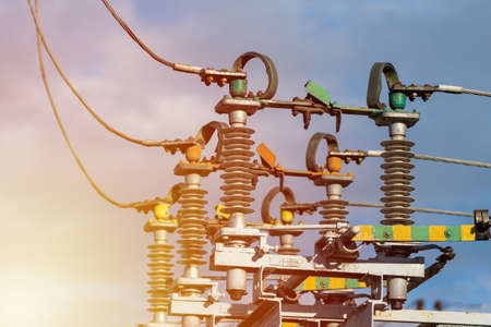 Polymer ceramic insulator with high voltage. Dangerous engineering facility. Close up.