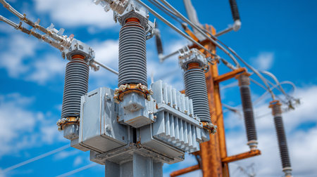 Close-up view of a high voltage electrical transmission tower equipped with isolators, contrasting against a clear blue sky dotted with fluffy clouds, showcasing modern infrastructure.