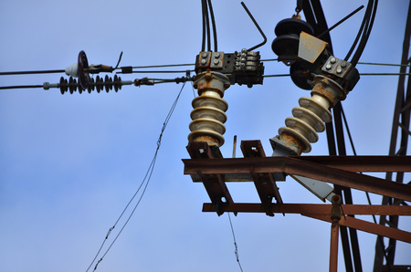 High voltage obsolete vintage electrical substation. Closeup on wiring, connections and insulators of a electrical substation.