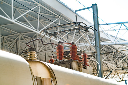 Electric train trolley pole. high speed railway electrification system. Overhead cable wire over rail track. Power lines.