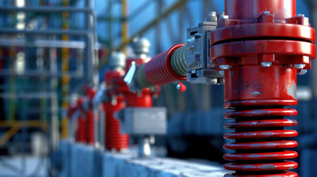 A detailed close-up image showcases a sophisticated industrial piping system featuring vibrant red pipes and valves within a manufacturing environment.