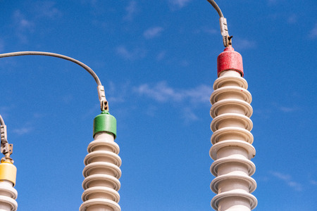 High voltage electric generator insulators.Detail of high voltage circuit breaker in a power substation.high voltage circuit breaker in a power substation on a clear sky.Copy space.