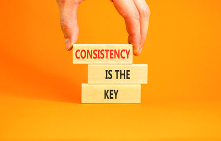 Consistency is the key symbol. Concept words Consistency is the key on beautiful wooden blocks. Beautiful orange background. Businessman's hand. Business consistency is the key concept. Copy space.
