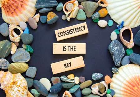 Consistency is the key symbol. Concept words Consistency is the key on beautiful wooden blocks. Beautiful black background. Sea shells and stones. Business consistency is the key concept. Copy space.