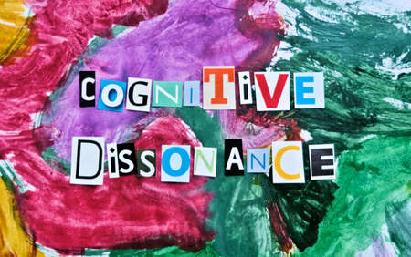 Partial blurred cut out colored letters from magazines and compilation of cognitive dissonance