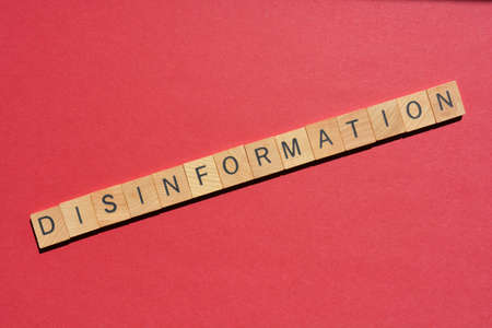 Disinformation, word in wooden alphabet letters isolated on red background with copy space