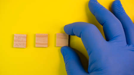 Hand in blue gloves point on clean wooden blocks on colored yellow background. Medical scientific or biological theme. Template for text or concept. Advertising mock up. Presentation flat lay mock up