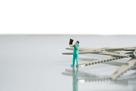Miniature people toy figure photography. A men doctor or nurse looking on X-ray results with surgical equipment, isolated on white background. Image photo