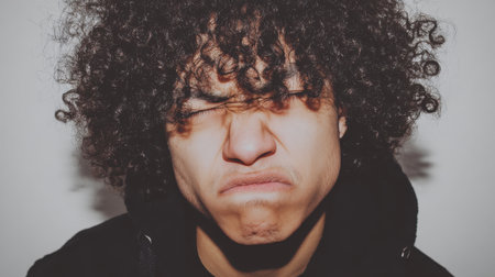Young Adult with Curly Hair Showing Expression of Anger and Frustration Against Plain Background in Portrait Mode