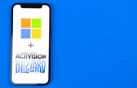 Kharkov, Ukraine - January 19, 2021: Microsoft and Activision Blizzard logos on smartphone screen. copy space photo