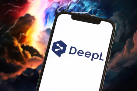 KYIV, UKRAINE - MARCH 17, 2024 DeepL logo on iPhone display screen with background of artificial intelligence futuristic ai generated image close up