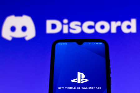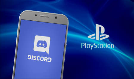 Discord App on smartphone screen with Playstation logo on background. PlayStation's announcing new Partnership with Discord, 3 May, 2021, Sao Paulo, Brazil