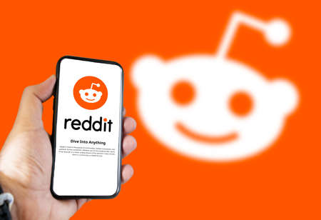 San Francisco, USA, December 2021: Hand holding a phone with Reddit mobile application on the screen. Reddit logo blurred on an orange background. Social news aggregation and discussion website