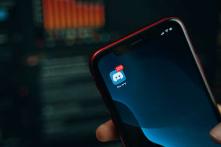 Bishkek, Kyrgyzstan - March 14, 2020: Discord voice communication app for remote work or study. icon of the application on apple iphone smartphone