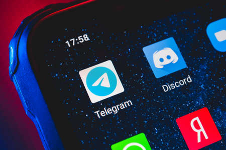 Telegram icon app and other messenger icon app on the screen smartphone closeup. Telegram is an online social media network.