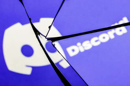 Kazan, Russia - Jan 20, 2022: of the Discord social gaming platform in the reflection of a broken mirror. The concept of problems in the work of Discord.