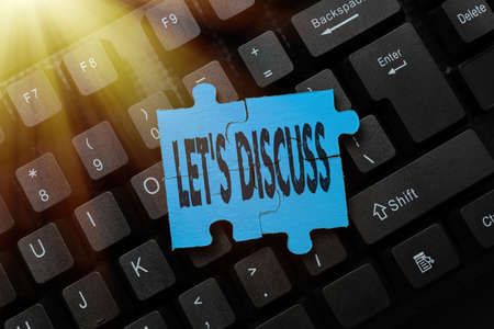 Text sign showing Let S Discuss. Word Written on asking someone to talk about something with person or showing Typing New Email Titles Concept, Drafting Internet Article Ideas