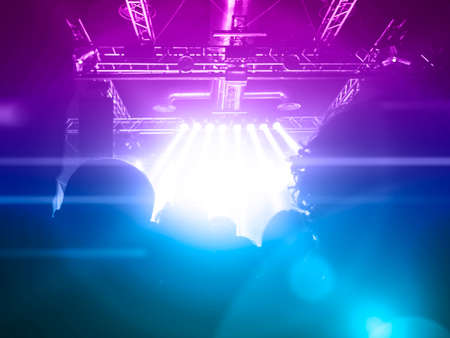Stage lights on concert. Lighting equipment with multicolored beams.