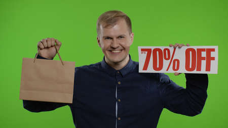 Excited happy emotions of store man client, smiling guy raising and showing sale purchase discounts advertisement inscriptions, looking satisfied with low prices. Chroma key background