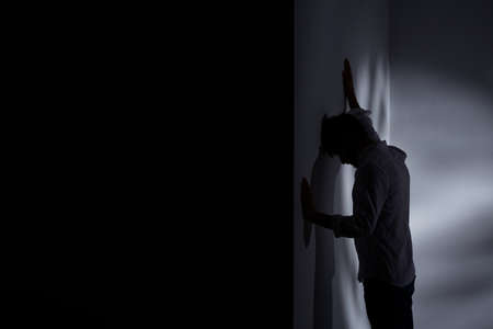 Dark room with sad man leaning against the wall