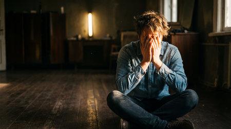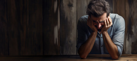 A man sitting with hands covering his face, displaying emotions of distress, sadness, or fatigue.