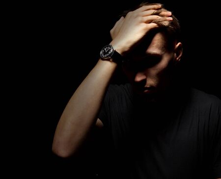 A man on a black background covers his face with his hands. The atmosphere of hopelessness, dejection