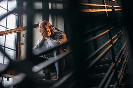 Male theif with bottle of alcohol sits on stairs