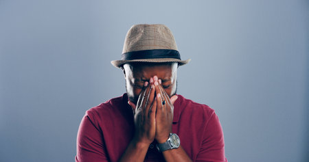 Sad, black man and crying with hat for breakup, pain or cancelled vacation on a gray studio background. Male person, expression or sulk eyes with tears for missed flight or delay on mockup space