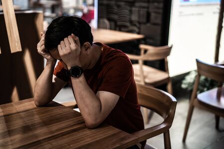 Young Asian restaurant shop owner stressed and head down, fear of bankruptcy from Covid-19 coronavirus pandemic outbreak.