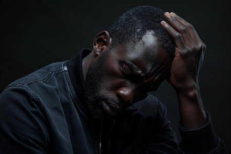 Featuring a man holding his head in hands, depressed mood on black background. dark and minimalistic photography of loneliness concept. black man suffering from depression or anxiety. high contrast photography