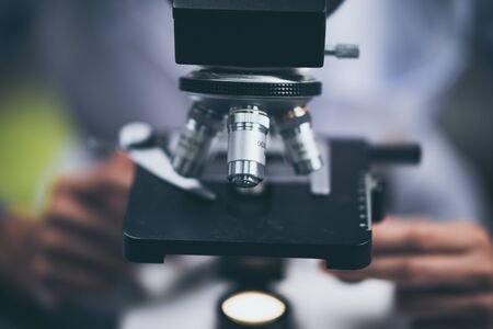 Laboratory equipment optical microscope, closeup of scientific microscope with metal lens, data analysis in the laboratory