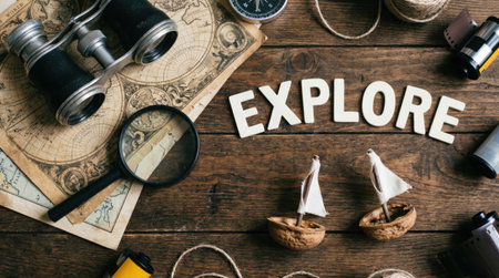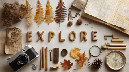 A flat lay composition featuring the word EXPLORE spelled out with wooden letters, surrounded by vintage travel items like a camera, map, and compass.