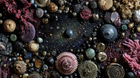 A captivating display of intricate shells and marine life arranged against a cosmic background, showcasing nature's beauty in detail.