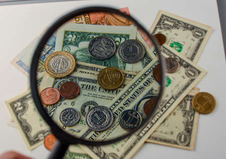 Dollars and magnifying glass. Hundred dollar banknote under magnifying glass.