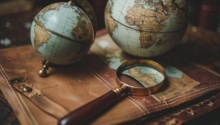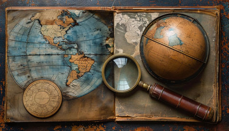 This evocative scene features a magnifying glass placed on a rustic wooden table surrounded by coins and vintage collectibles, evoking a sense of history and exploration.