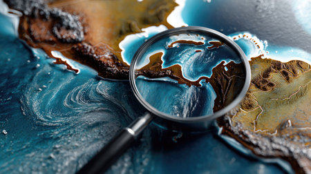 A close-up view of a 3D map showing Central America with a magnifying glass, emphasizing geographical details and the surrounding oceanic areas.