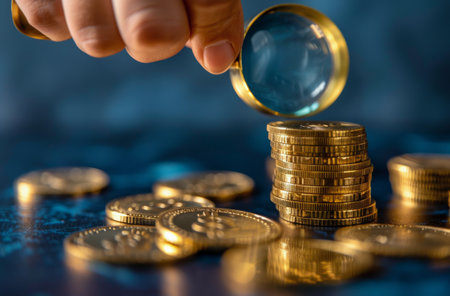 A hand holds a magnifying glass over a stack of gold coins, revealing the details of the coins. The coins are stacked on a wooden table against a blue background.