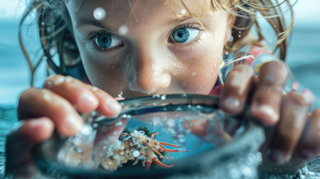 The toddler is happily looking through a magnifying glass, her eyes wide with curiosity and a big smile on her face. She is having fun exploring the world around her AIG50