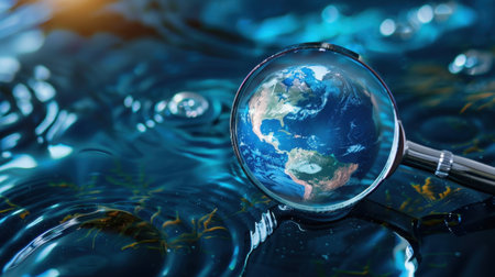 A stunning close-up of a globe reflecting on a water surface, surrounded by ripples and light, evoking themes of exploration and environmental awareness.