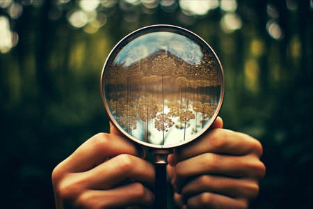 A hand holds a magnifying glass, focusing on a cluster of white flowers, with a blurred background of green foliage.