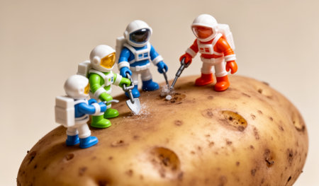 Miniature astronauts gather around a potato, using tiny tools to examine its surface. This whimsical scene takes place on a smooth backdrop, evoking a sense of adventure in a quirky setting.