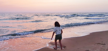 A child walks along the beach at sunset, gazing at the gentle waves under a pastel-colored sky.