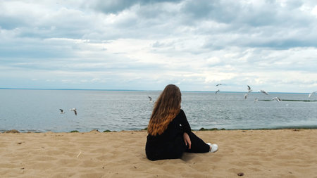 Woman sitting on the sandy shore looking at a lake and cloudy sky with flying seagulls. Concept. Rear view of a young girl with curly long hair sitting in front of the river and looking into the distance.
