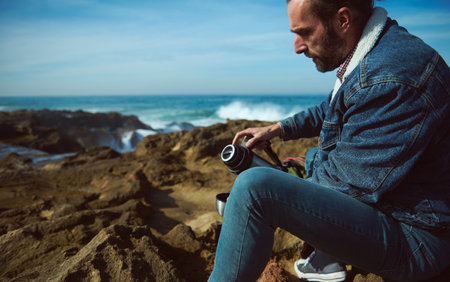 Close-up side portrait of a Caucasian handsome relaxed bearded man tourist pouring hot tea or coffee from into a mug, resting by ocean. Breaking waves on the headland on the background