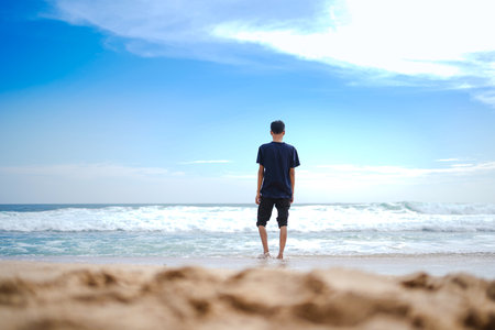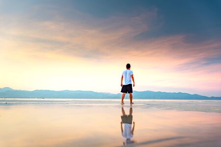 Adult male in white shirt enjoying the early morning walk at the shore of Boracay, Philippines.