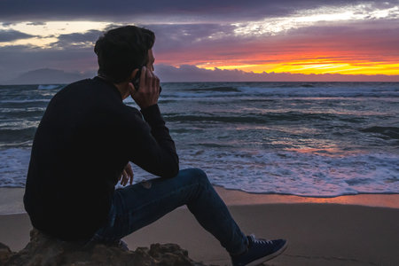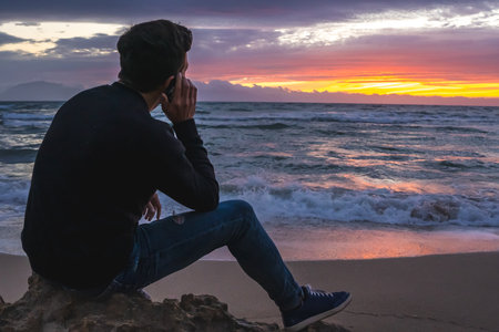 Silhouette of a young traveler man with his back turned at sunset, with the water of the sea and a beautiful sky with clouds and full of colors.