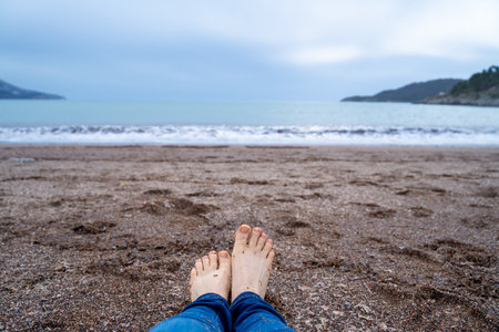 Unrecognizable woman walking on coast in the evening, view of legs near the sea