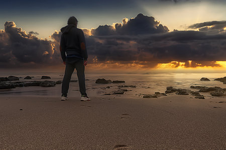 Man standing on a rock formation watching the colorful sky at sunset as waves wash onto the rocky shore around him, Point Dume State Beach, Malibu, California